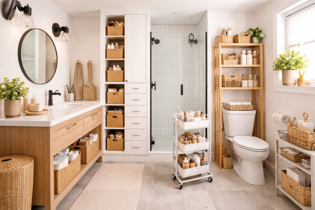 Using baskets, bins, and containers helps group items together and keeps everything easy to find. Different sizes allow you to organize everything from small items to larger household essentials. These types of storage solutions are widely used because they are affordable, flexible, and easy to maintain.