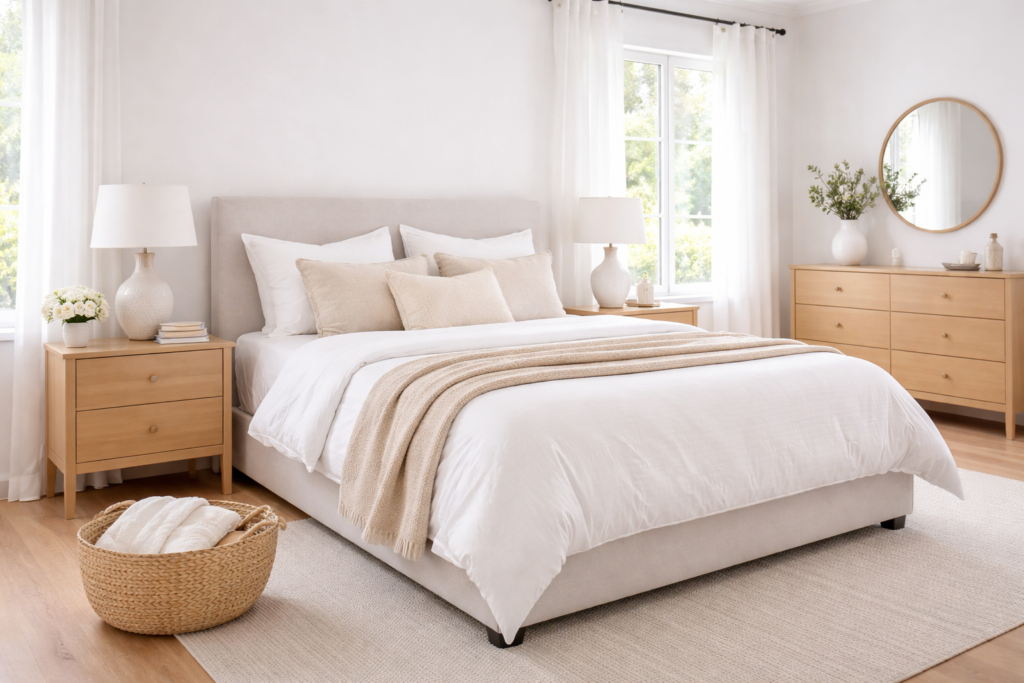 A made bed instantly makes the room feel organized, even if everything isn’t perfect yet. It becomes the visual anchor of the space and sets the tone for the rest of the room.