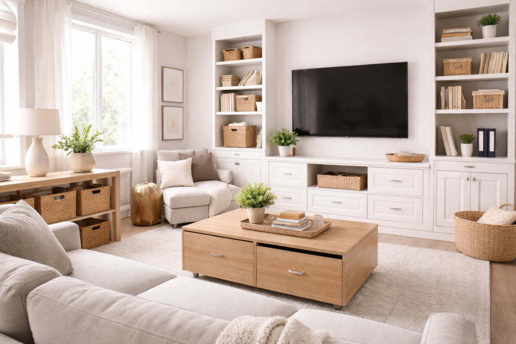 The living room is where everything tends to gather. Blankets, remotes, books, and everyday items slowly build up until the space feels cluttered.